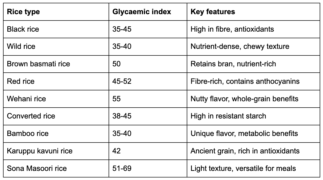 Black rice, often called forbidden rice, is one of the most nutrient-packed and blood sugar-friendly rice options out there. With a glycaemic index of 35 to 45, it offers a much better option for managing blood sugar levels compared to traditional white rice.